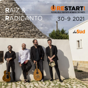 Saranno i concerti e dunque la musica a chiudere, come da tradizione, le tre principali serate di Restart. Si comincia il 30 settembre con Musica Immaginaria Mediterranea, il progetto musicale nato dall’incontro di RAIZ, storica voce del gruppo Almagretta, con RADICANTO, mentre lo showcase del rapper KIAVE, nome d’arte del calabrese Mirko Filice, chiuderà il secondo giorno di appuntamenti insieme alla CREW di MOVE ON-UP, progetto di formazione e produzione musicale promosso da daSud con il sostegno di Alta Mane Italia che supporta la formazione e la crescita di cinque giovani talentuosi rapper della periferia romana. A conclusione della settima edizione della kermesse, sabato 2 ottobre, la voce e il cantautorato del romano FOLCAST, nome d’arte di Daniele Folcarelli, che è stato uno dei 6 vincitori dell’ultimo Sanremo Giovani, la kermesse musicale che gli ha aperto le porte della 71^ edizione del Festival di Sanremo nella categoria Nuove Proposte, dove ha conquistato il podio classificandosi al terzo posto.