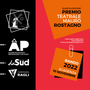 Promosso da ÀP – Accademia Popolare dell’antimafia e dei diritti con Associazione daSud e Compagnia Ragli per incentivare e sostenere la produzione artistica che ruota attorno ai temi del teatro civile, il bando rivolto a singoli artisti o compagnie teatrali è aperto fino al 10 novembre